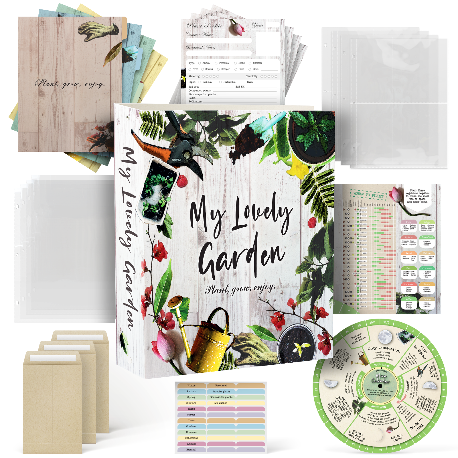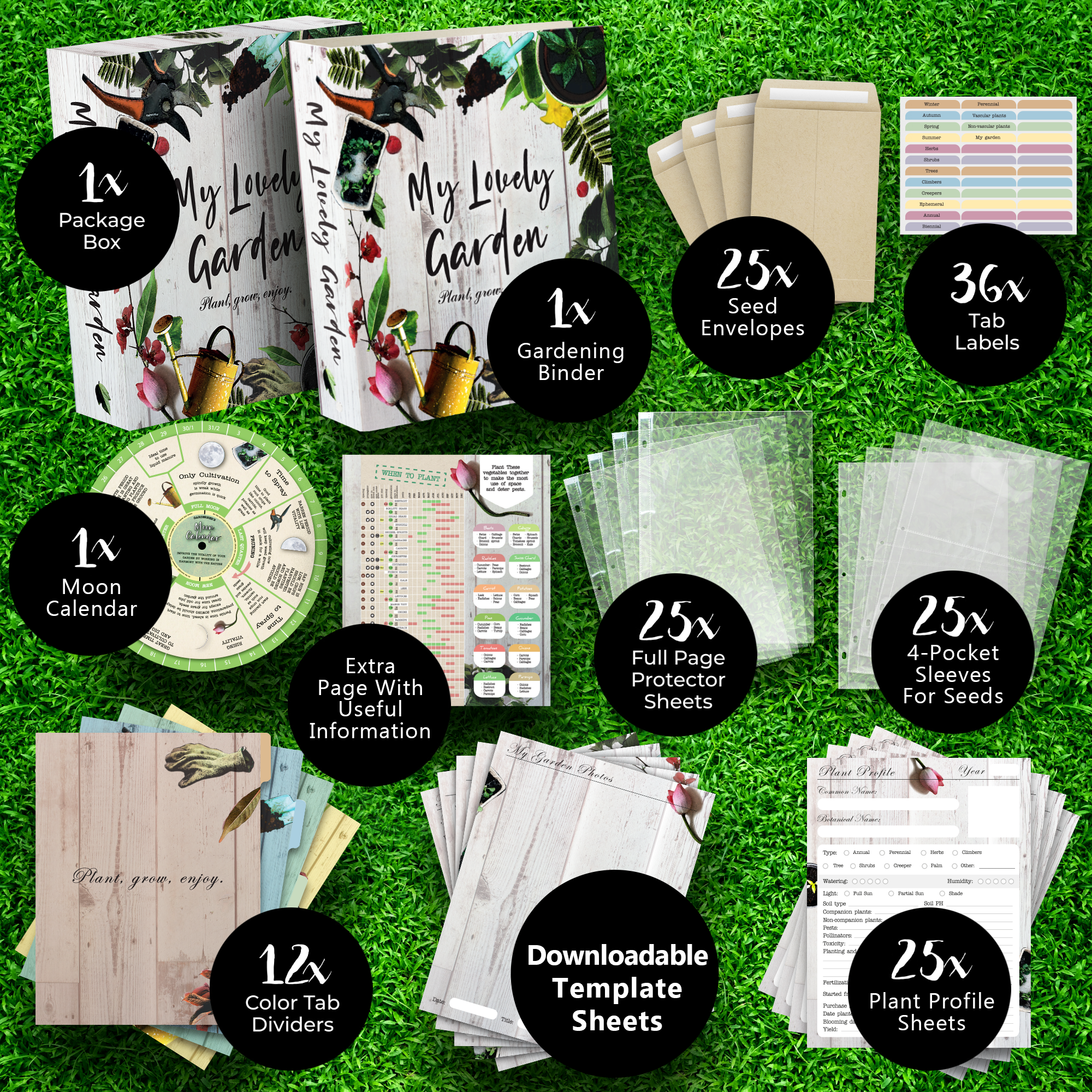 All in one gardening binder kit includes 1 hard cover three-ring durable binder cover, 30 clear page protectors & 20 seed sleeves, 16 color dividers to sort categories, and 32 label stickers, extra information page and gardening moon calendar. This kit has everything you need to organize your garden!