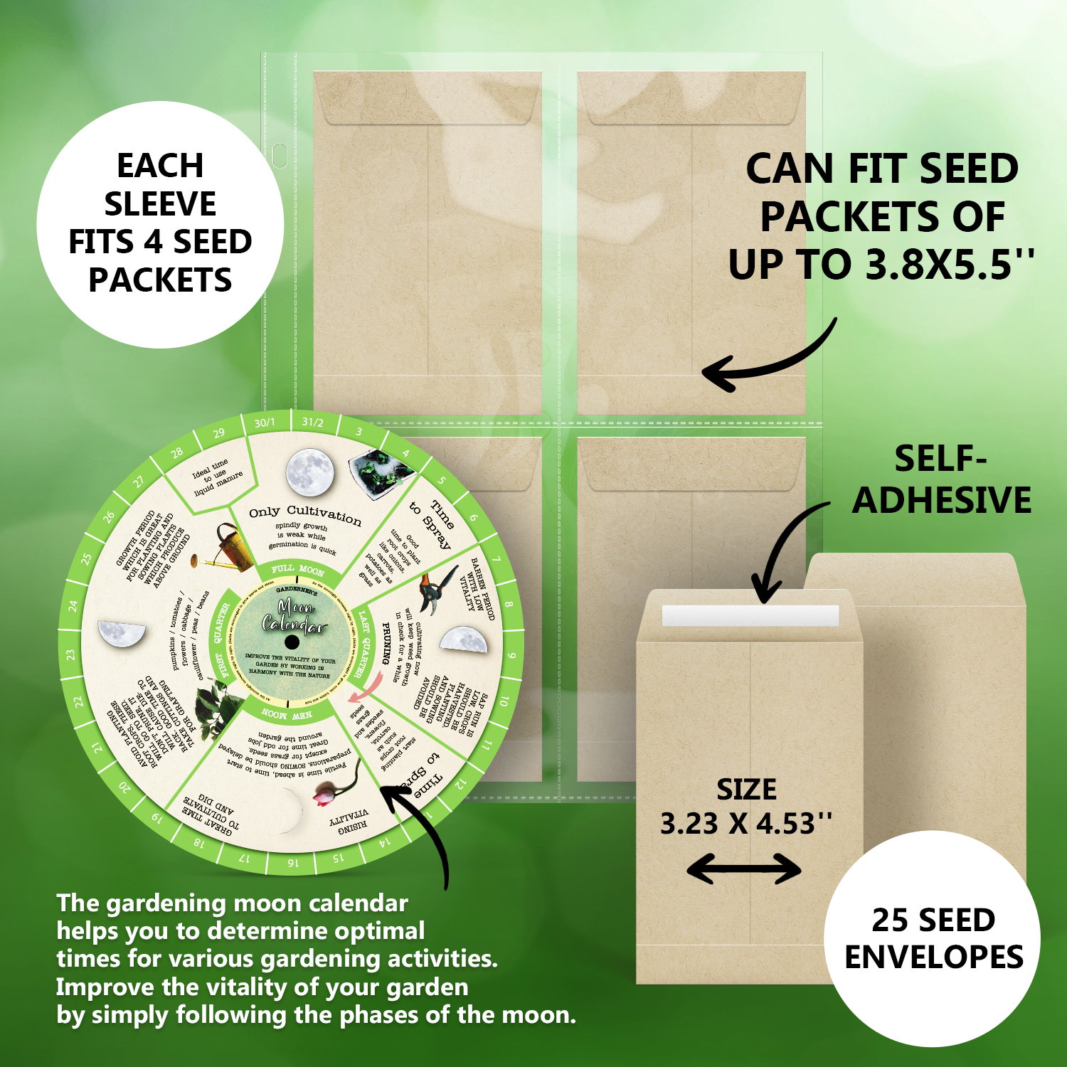 🌱PLETHORA OF USES – Included seed organizer plastic sleeves help you organize your seeds in one convenient place, regular plastic sleeves help protect your valuable gardening information from spills & yellowing. Dividers and tab labels make organizing your essential gardening information a breeze. Information on the cover and on the extra page & moon calendar help you take your gardening to the next level. The downloadable templates help you get started without having to start from scratch.