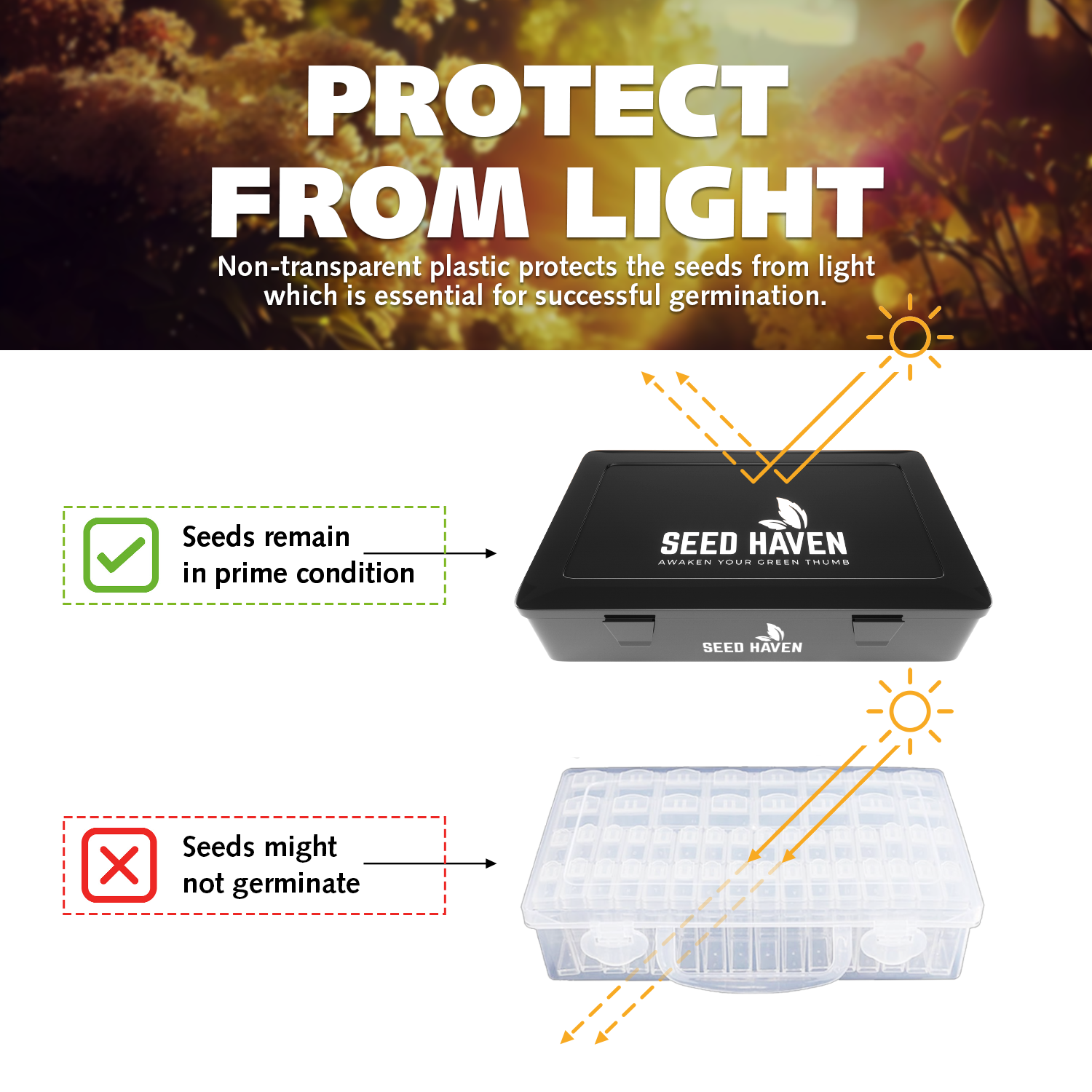 NON-TRANSPARENT BOX – Light exposure can trigger premature energy allocation in seeds that should remain dormant. Seeds are equipped with mechanisms to sense light, and if light reaches them before they are ready to sprout, they might channel energy toward growth prematurely, depleting their stored reserves and weakening their chances of successful germination. Our opaque seed storage box provides a safe and secure environment for the seeds until they are planted.